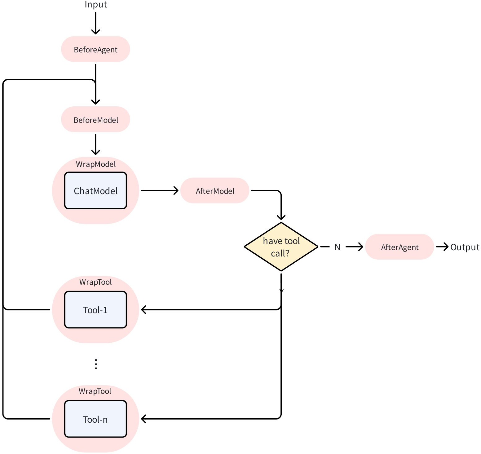 • It returns the tool result to ChatModel (Observation), then starts a new cycle until ChatModel determines no Tool call is needed and ends.
