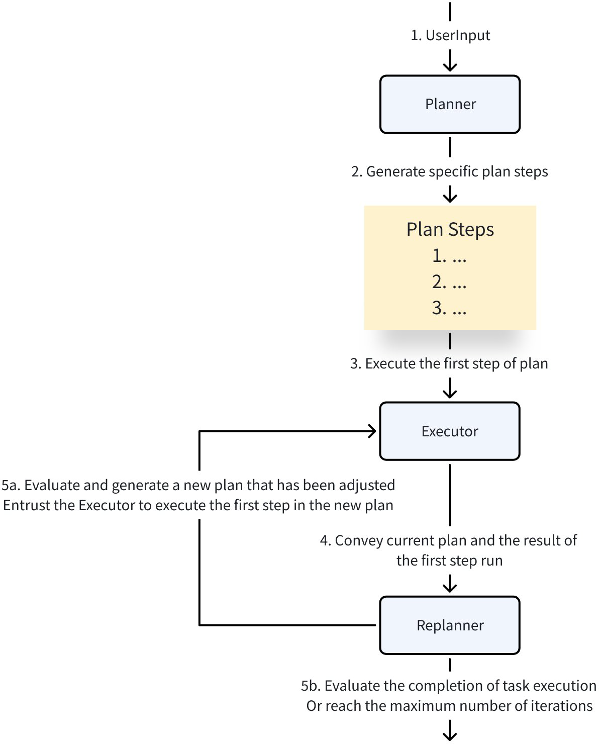 LoopAgent: Loops execution ofExecutorandReplanneruntil task completion or maximum iterations reached